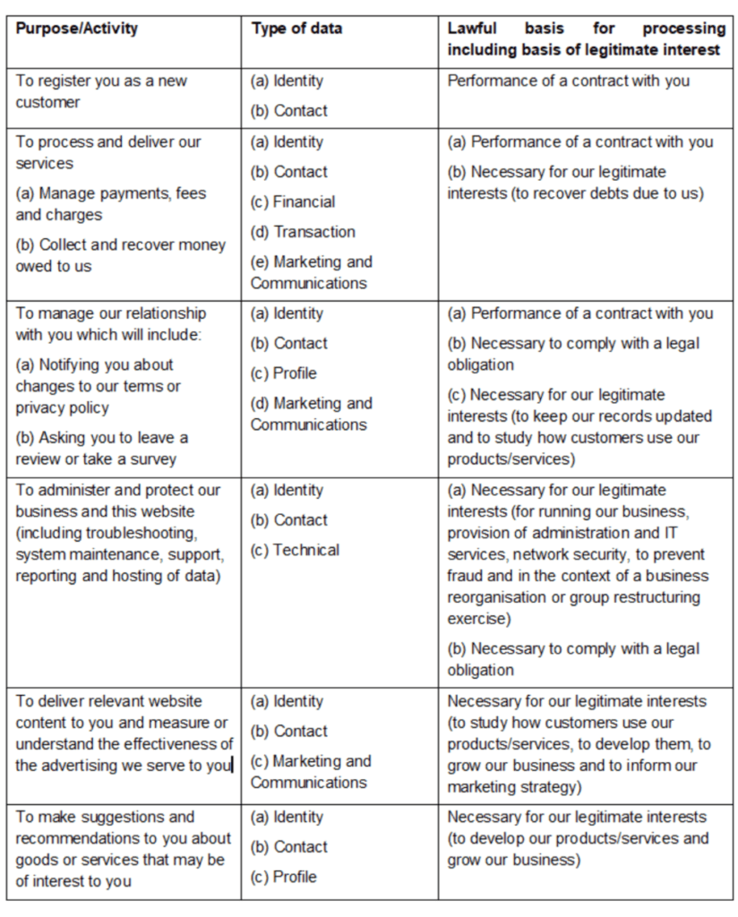 We have set out below, in a table format, a description of all the ways we plan to use your personal data, and which of the legal bases we rely on to do so. We have also identified what our legitimate interests are where appropriate.